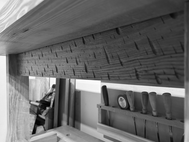 The bench incorporated saddled joinery to marry with the multi-tiered aspects of Tom’s design, it also had water drops carved on the rail that split the two bench tops apart. as if to mimic the droplets from a gardener who’d just taken a plunge.